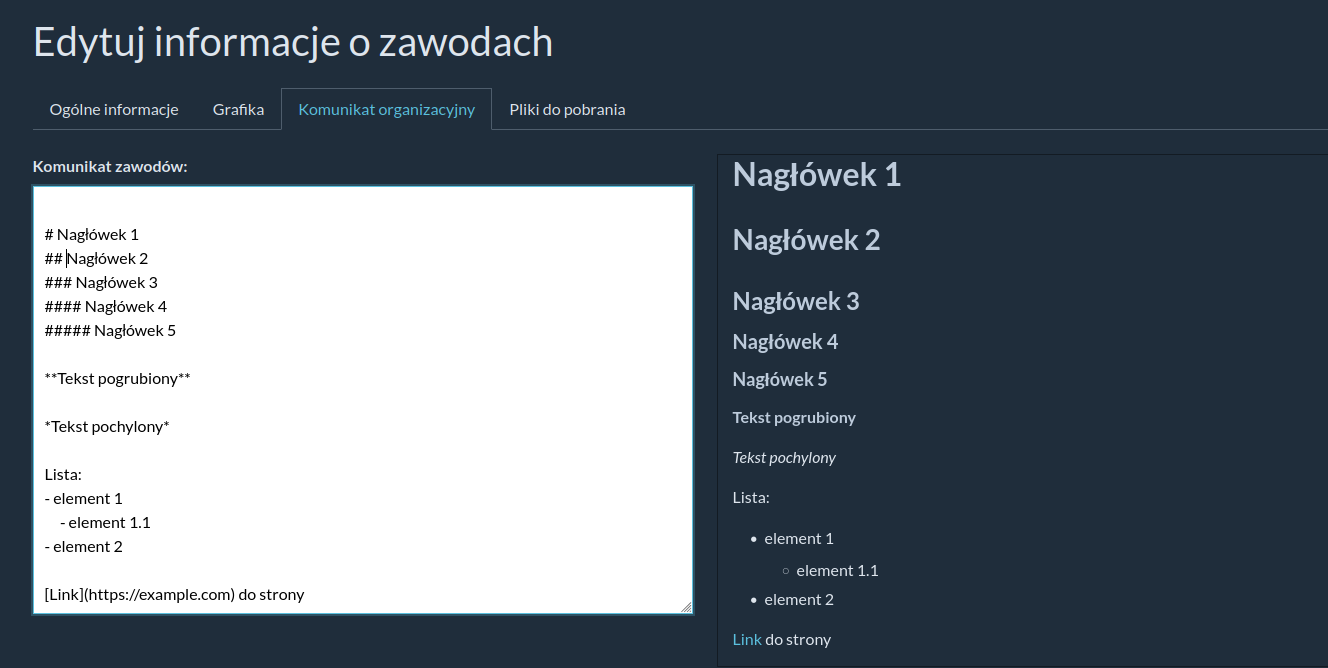 Treść komunikatu organizacyjnego może być sformatowana w pewnym zakresie. Wymaga to użycia odpowiedniej składni.