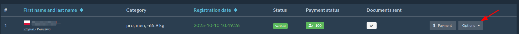 - Na próxima página, procure o competidor e clique em Opções ao lado do nome dele para Editar os detalhes do competidor.